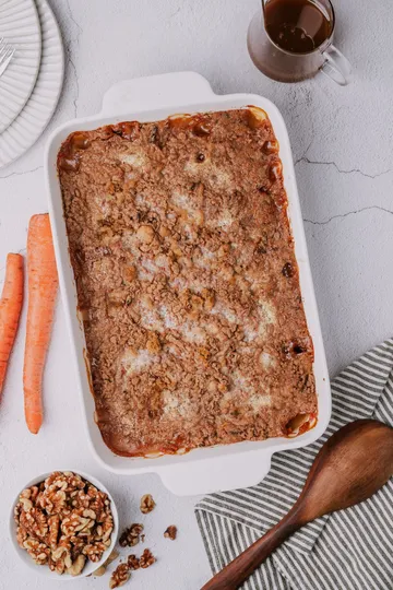 - Evenly sprinkle the dry carrot cake mix over the pineapple and walnuts—no mixing needed!