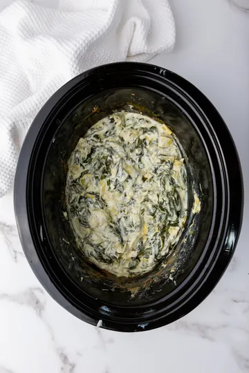 - Add chopped artichokes and fresh spinach to the slow cooker.