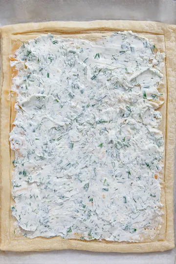 - Evenly spread the herb cream mixture inside the puff pastry border.